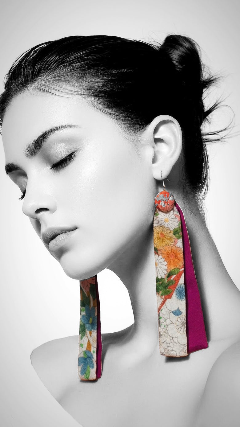 Long-length kimono double-layer earrings (Floral pattern × Red)