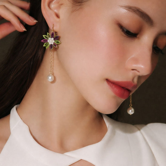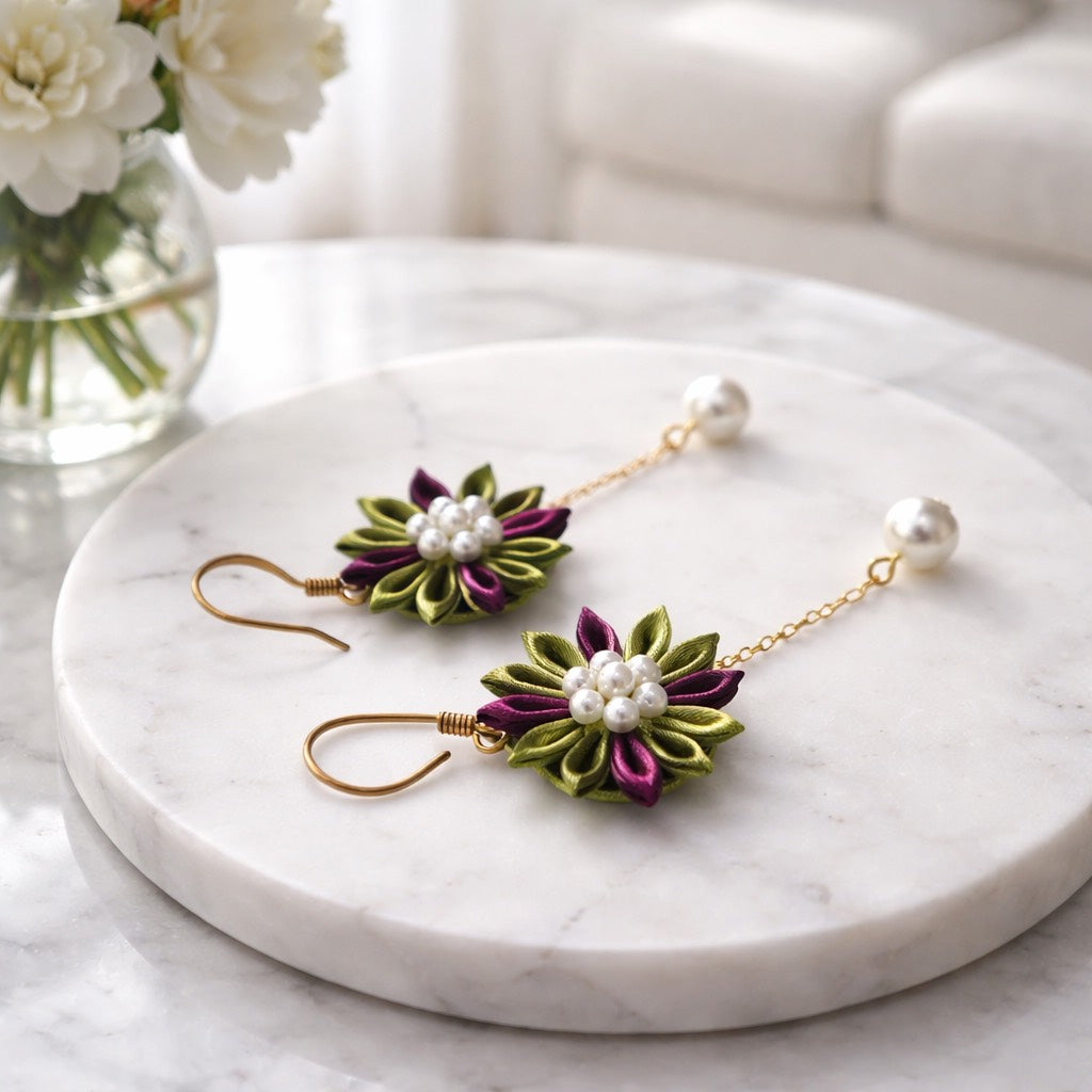 Tsumami-zaikku earrings that are easy to coordinate in autumn and winter. The deep color with pearl accents is the most stylish.